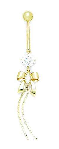 Studio : JewelryWeb Publisher : JewelryWeb Binding : Jewelry Product Description 14k Yellow Gold Cubic Zirconia 14 Gauge Dangling Bow and Chain Body Jewelry Belly Ring - Measures 50x9mm - in 14k Yellow Gold - JewelryWeb Style: MDR187567W - FREE gift-ready jewelry box [ Potential Enhancement Methods: cubic zirconia ] - Synthetic. Some are covered with a product that makes the stone more durable. [ Care and Handling: cubic zirconia ] - Clean with warm soapy water and a soft cloth.