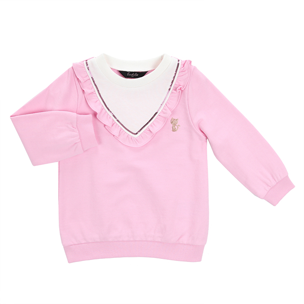 - 화이트 컬러의 요크 배색과 핑크 컬러가 믹스된 롱 맨투맨입니다. 엉덩이를 덮는 긴 기장입니다. 네크라인에 브이 라인의 배색 요크와 프릴장식이