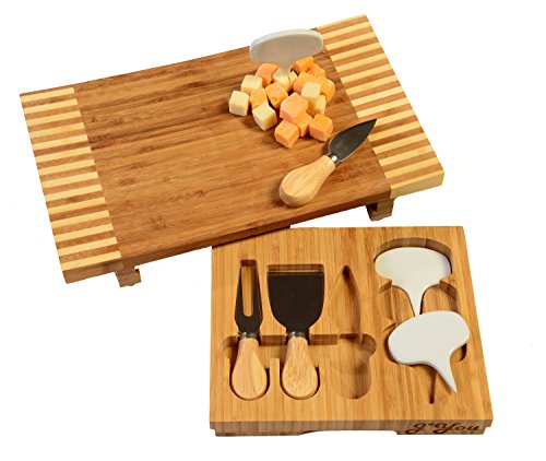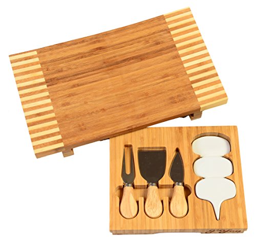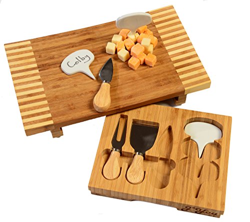 100% NATURAL BAMBOO Cheese Board set includes board with decorative edge detailing with hidden pullout drawer, 3 piece cutlery slicing, spreading and serving utensils, and 3 ceramic reusable cheese markers.
