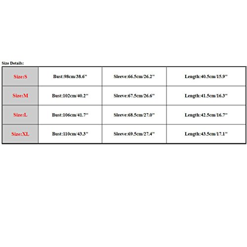? Size Measurement? Size:S Bust:98cm/38.6" Sleeve:66.5cm/26.2" Length:40.5cm/15.9" Size:M Bust:102cm/40.2" Sleeve:67.5cm/26.6" Length:41.5cm/16.3" Size:L Bust:106cm/41.7" Sleeve:68.5cm/27.0" Length:42.5cm/16.7" Size:XL Bust:110cm/43.3" Sleeve:69.5cm/27.4" Length:43.5cm/17.1"