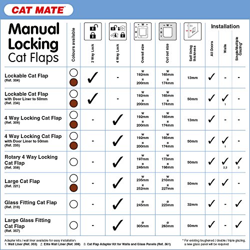 Product DescriptionFor cat owners wanting greater control over their cats' access to and from the house, the 4-Way Locking Cat Flap offers exceptional value for money. Fits any thickness.