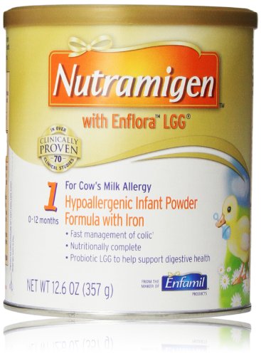 Nutramigen with Enflora LGG* is clinically proven to manage colic due to cow’s milk allergy fast, often within 48 hours†. The powdered form includes the probiotic LGG and has been proven to help build oral tolerance to cow’s milk. Nutramigen with Enflora LGG provides complete nutrition for your baby’s first year and is proven in over 70 studies. Its extensively broken-down proteins are hypoallergenic and easy to digest.