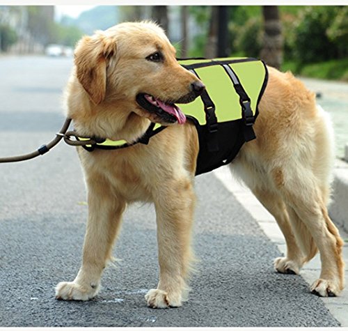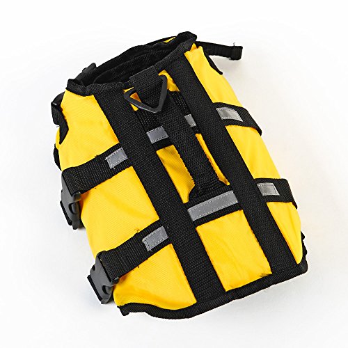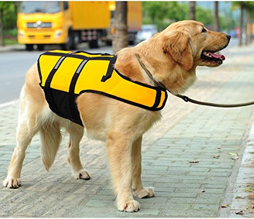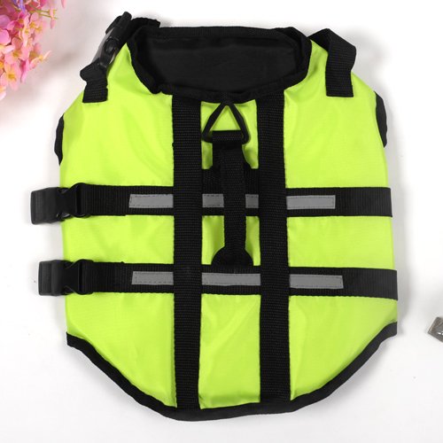 -. Feature : Reflective Dog Swimwear in eye-catching colors / Made of waterproof oxford cloth +Float foam / Adjustable nylon straps plus quick-release buckles / Size S: Chest girth 15-19 inches, Back length 9.4 inches, Neck girth 13-15 inches / Emergency Security pull ring on the back
