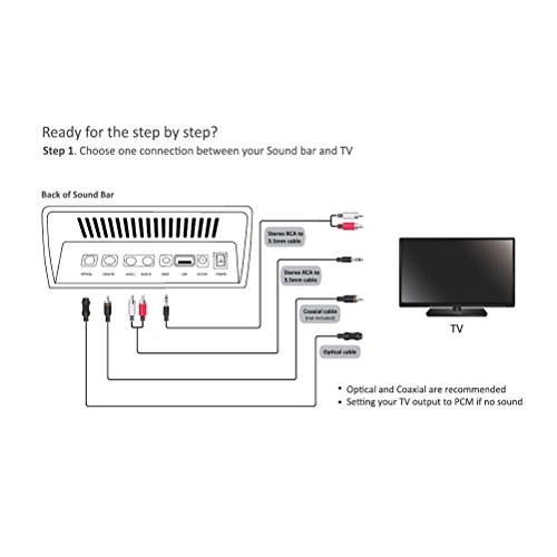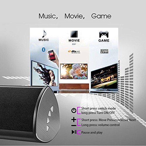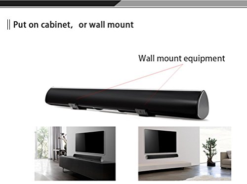 -. Feature : 34 Inch Sound Bar<860*100*105mm>; 3D surround sound mode, meets your different viewing experencies;Built-in woofer. Powerful sound, simple set up and elegant design / Multiple options for connection - Bluetooth 4.0, Optical Audio Cable or 2 Aux Cable Jacks, Coaxial / Enabled with Optical/Coaxial input function ,100% compatible with your TVs/PCs/Phones/Tablets etc , experience the high quality and powerful sound. / This is a complete, integrated soundbar system that streams music and dramatically improves the sound reproduction of desktop or laptop computer. The soundbar is a plug-and-play easy-to-install solution / High tech Bluetooth lets you listen to music with a tap of a finger, playing music from the devices from several rooms over with no interference, up to 40 feet!
