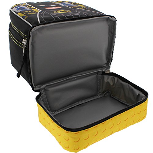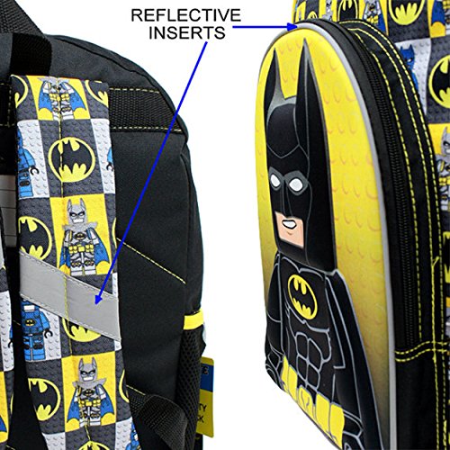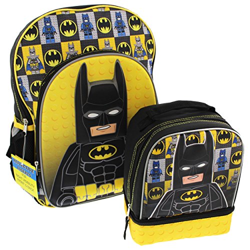 Product Description This Lego Batman backpack and lunch box set is perfect for your little superhero! It can easily carry books, gym clothes, pencils, and more! This Batman day pack features reflective inserts, a roomy main compartment, two side mesh pockets, and a front zip compartment that features an awesome 3D pop molded image of Batman that is perfect for smaller supplies. This book bag can be hung up when not in use by the webbed locker loop. The matching dual compartment lunch box makes lunchtime fun and exciting with an insulated interior, zipper closure, and a holding strap for easy carrying. The back pack and lunch bag is designed in durable fabric with images of your favorite The Lego Batman Movie character: Batman! It's the perfect back to school choice for any Dark Knight, Caped Crusader, or Lego fan! 0