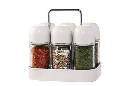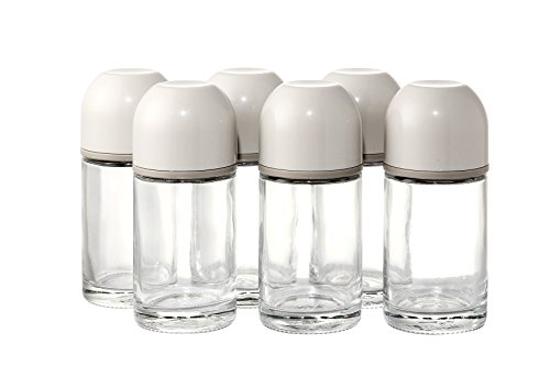 Glass Spice Jar Bottles with Dispenser Tops and Organization Caddy Rack - Clear/White - 6 Piece Storage Set - 3.5 oz.