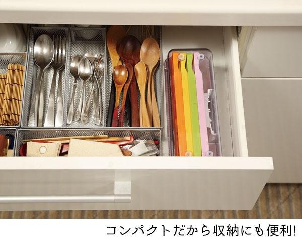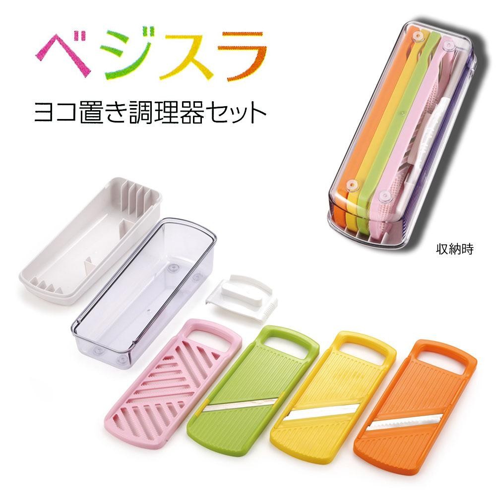 | 個々に色が付いているので 使いたいスライサーが一目で分かります 専用ケース付でキッチンの引き出しなどにコンパクトに収納できます 滑り止め・安全ホルダー付 |
