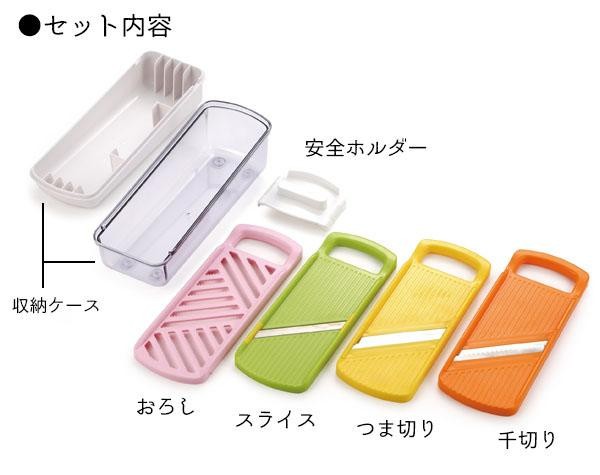 | セット内容 | 千切り(オレンジ)×1 つま切り(イエロー)×1 スライス(グリーン)×1 おろし(ピンク)×1 安全ホルダー×1 収納ケース×1 |