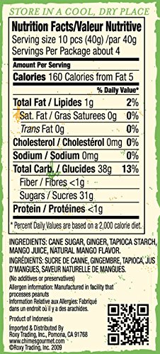 Tender, pure Ginger, stone pureed with mango juice to make a chewy and fruity treat! Chimes Ginger Chews - it's music in your mouth! All natural and gluten free!