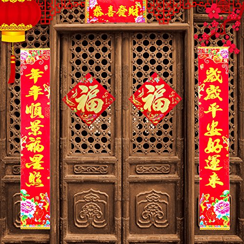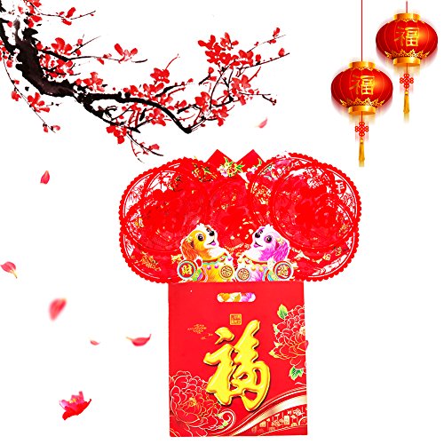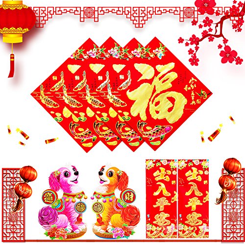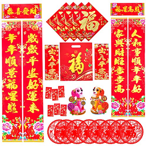 - Include 25pcs in total: 1. One pair gold print couplets with banner (110x18cm, random poems); 2. One pair gold print couplets with banner (90x15cm, random poems)3. Eight window papercuts (28cm ); 4. Four Fu character sticker; 5. Six red envelopes(17x9cm); 6. Two Chinese zodiac dog stick (25cm ); 7. One Fu bag (42x36cm)