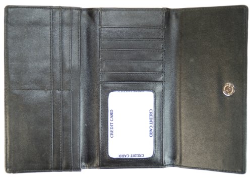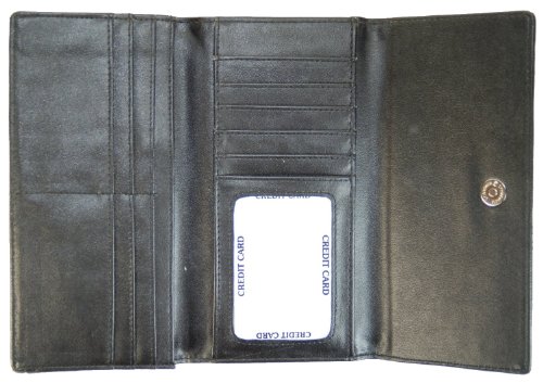 Product DescriptionMaterial: PU Leather Size (width x height): 7.5" x 3.75" Credit Card Slots: 11 I.D. Window: Yes Currency Pocket: Divided pocket Other features: Snapping enclosure for security; Interior zippered pocket0