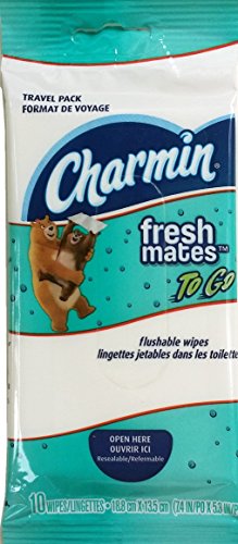 Charmin To Go 5 toilet seat covers and Charmin Freshmates to go pack of 10 flushable wipes.