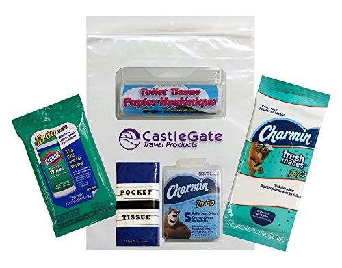 Travel Sanitation Kit with travel size toilet tissue, pack of 5 toilet seat covers, pack of 9 Clorox disinfecting wipes and pack of 10 Charmin flushable Freshmate wipes in a handy CastleGate Travel zipper bag.