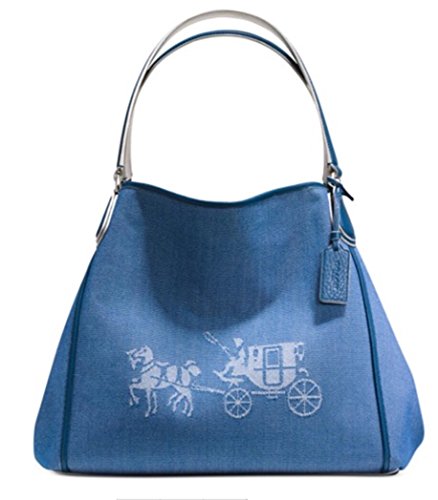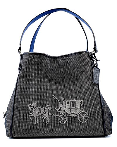 Unexpected pops of contrast color and polished hardware brighten the simple shape of the latest Coach Edie. Emblazoned with a tonal Horse and Carriage, this well-organized design is finished by hand in elegantly textured canvas with rich leather trims. Canvas with leather trim Inside zip, cell phone and multifunction pockets Zip closure, fabric lining Handles with 10 1/2 drop Interior features 13 3/4" (L) x 11" (H) x 6 1/4" (W)Feature
