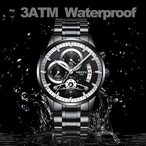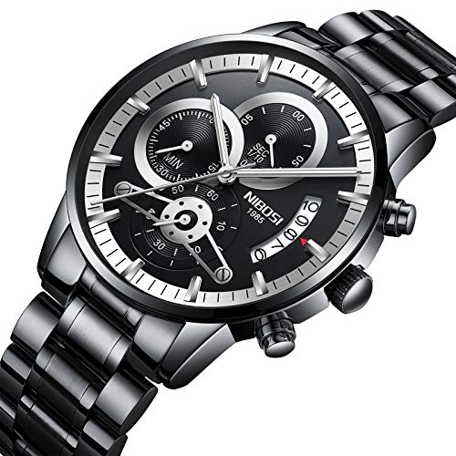 Brand, Seller, or Collection Name:NIBOSI Part Number:2309-1-QHYDgd Item Shape:Round Dial window material type:Synthetic sapphire Display Type:Analog Clasp:Fold-Over Clasp with Hidden Double Push-Button Case material:Stainless steel Case diameter:43.69 millimeters Case Thickness:10.65 millimeters Band Material:Stainless steel Band length:235 mm Band width:22 millimeters Band Color:Black Dial color:Black Bezel material:Stainless steel Bezel function:24 hour time display Calendar:Date Special features:Chronograph Movement:Analog quartz Water resistant depth:30 Meters