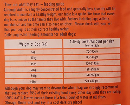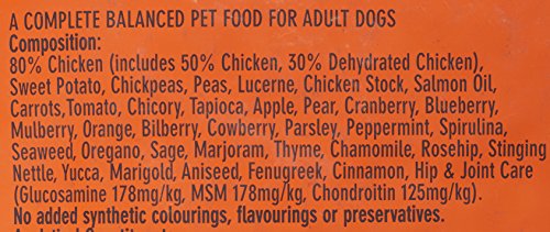 原材料:鶏生肉(骨抜き)50%、乾燥鶏肉 30%、サツマイモ、ヒヨコマメ、エンドウ、アルファルファ、鶏グレイビー、サーモンオイル 1%、ニンジン、トマト、チコリ、タピオカ、リンゴ、ナシ、クランベリー、ブルーベリー、マルベリー、オレンジ、ビルベリー、コケモモ、パセリ、ペパーミント、スピルリナ、海藻、オレガノ、セージ、マジョラム、タイム、カモミール、ローズヒップ、セイヨウイラクサ、ユッカ、マリゴールド、アニス果、フェヌグリーク、シナモン、グルコサミン 350mg/kg、MSM 350mg/kg、コンドロイチン 240mg/kg、酸化防止剤(天然ミックストコフェロール)