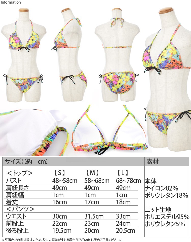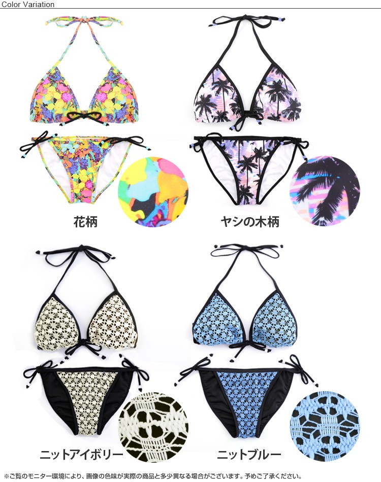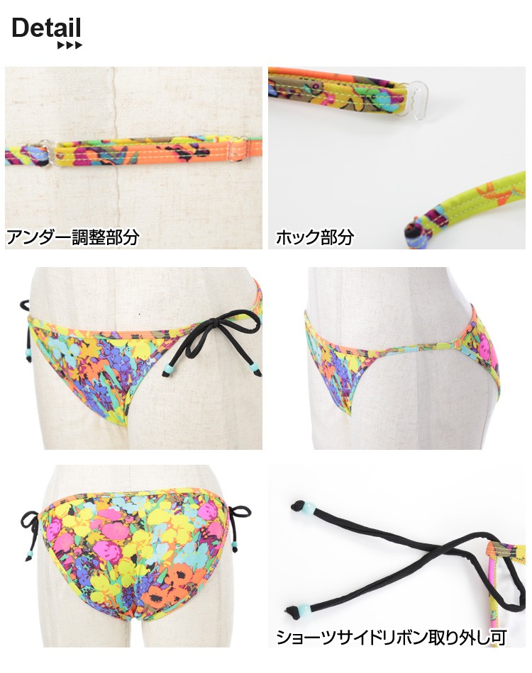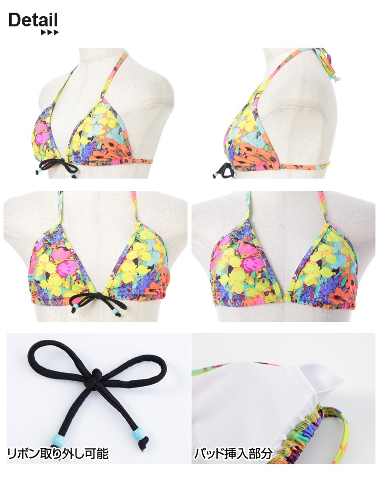 | 商品説明 | 定番人気のシルエットと言えば… やっぱり『三角ビキニ』♪ 夏らしいカラフルな花柄やヤシ柄に加え、 お洒落感たっぷりなニット素材までご用意★ リボンの先にはそれぞれの柄に合わせた カラービーズをアクセントでON♪ ブラトップ、ショーツ共に リボンは取り外し可能なので 気分に合わせてchangeするのもオススメ◎ ※輸送上の都合により、多少の汚れ・シミなどが見られる場合がございます。 また、発送上の状態によって商品がシワになる場合がございます。予めご了承くださいませ。 |