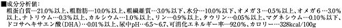 素材構成:粗蛋白質…16.5%以上、粗脂肪…6%以上、粗繊維質…5%以下、水分…10%以下、カルシウム…1.6%以上、リン…1.19%以上、ナトリウム…0.3%以上、タウリン…0.05%以上、オメガ3…0.3%以上、オメガ6…1.7%以上、尿中pH…6.5~6.7