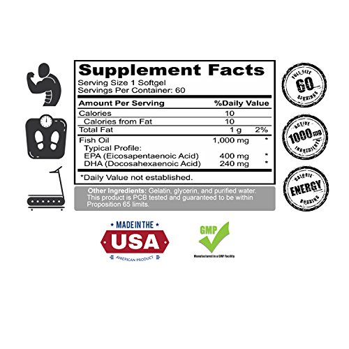 - 1000mg Fish Oil, 400mg EPA and 240mg DHA per serving