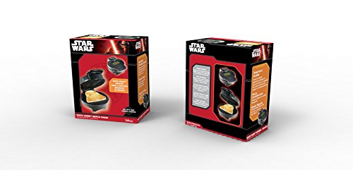 WM-SRW-RD-VAD-B Features: -Coated, non-stick darth vader plate. Wipes clean with a damp cloth. -Dual indicator lights let you know when it's time to pour the batter and when the waffles are ready. -Five temperature settings let you make waffles tender and golden or brown and crispy with a turn of the dial. -Officially licensed. -Regulating thermostat and weighted lid ensure perfect and even browning. -Material: Sturdy stainless steel. Product Type: -Standard waffle maker. Indicator Light: -Yes. Non-Stick: -Yes. Primary Material: -Plastic. Finish: -Plastic. Grids/Plates Included: -Yes. Dimensions: Overall Height - Top to Bottom: -3.31". Overall Width - Side to Side: -7.88". Overall Depth - Front to Back: -9.69". Overall Product Weight: -2.7 lbs.Feature