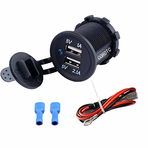COROTC Dual USB Charger Adapter Socket 12V 1A 2.1A Waterproof Outlet Power Jack with Wire for Vehicle, Motorcycle, ATV, Boat, Car or Marine