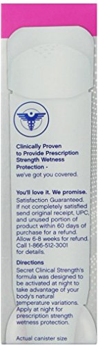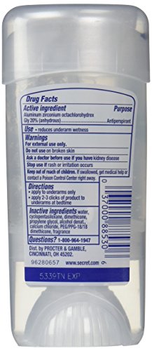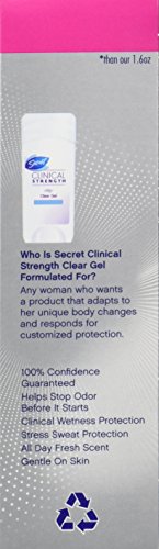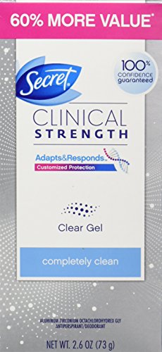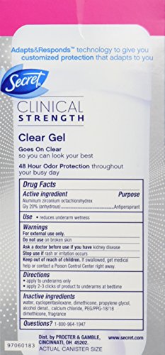 -. Binding : Health and Beauty -. Brand : Secret -. EAN : 0798813013057 -. Feature : Secret Clinical Strength Clear Gel. Goes on clear, stays on clear with no white marks / Prescription-strength wetness protection / Protection from stress sweat / Odor-fighting capsules that absorb odor all day long / Completely Clean: There's no question this scent keeps you feeling clean / #1 awarded antiperspirant/deodorant** and doctor recommended (**Among beauty magazines for 2008-2010) -. IsAdultProduct : 0 -. Label : P&G -. Manufacturer : P&G -. Model : NA -. MPN : PG-6831 -. NumberOfItems : 1 -. PackageQuantity : 1 -. PartNumber : PG-6831 -. ProductGroup : Beauty -. ProductTypeName : HEALTH_PERSONAL_CARE -. PublicationDate : 2013-12-19 -. Publisher : P&G -. ReleaseDate : 2014-01-20 -. Studio : P&G -. Title : Secret Clinical Strength Clear Gel Women's Antiperspirant & Deodorant Completely Clean Scent 2.6 Ounce -. UPC : 037000885276 -. Warranty : You'll love it. We promise. Satisfaction guaranteed. If not completely satisfied send original receipt, UPC, and unused portion of product within 60 days of purchase for a refund.