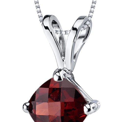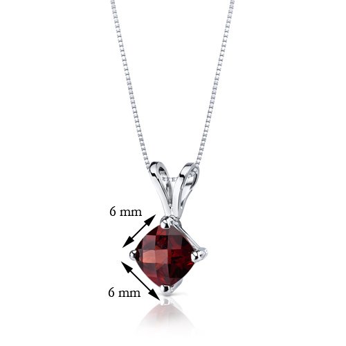 Gemstone: Genuine Garnet, Cushion Cut, 6 mm, 1.1 carats, Plum Red Hue with Brilliant Sparkle. Pendant: 0.56 grams pure 14k White Gold with 14k stamp. Pendant feature exceptional Design, Craftsmanship and finishing. Perfect gift for Mothers Day, Birthdays, Valentines Day, Graduation, Christmas or just about any other occasion. Money Back Guarantee. Includes a Signature Gift Box. Includes matching 18 inch Sterling Silver Rhodium Finish Box Style Chain. Style P9142Feature