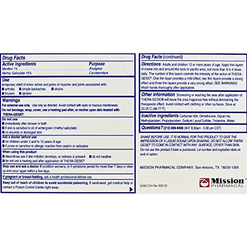 -. Feature : Thera-Gesic Pain Reliever with Aloe Temporary relief of minor aches and pains of muscles and joints associated with: arthritis, simple backaches, strains, bruises, sprains. THERA-GESIC PLUS provides extended relief for minor aches and pains associated with arthritis and lower back strains. THERA-GESIC PLUS contains both menthol and methyl salicylate as an analgesic and counterirritant for penetrating pain relief. THERA-GESIC PLUS also contains aloe vera as a skin conditioner.