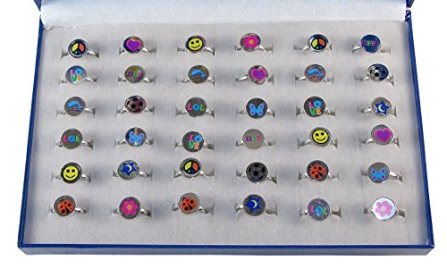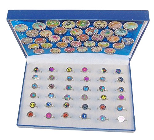 RINGS : 72 pieces display box of costume jewelry ring sets that are sold as a 2-piece set consisting of a ring base and a magnetic bottle cap topper (36 sets total).