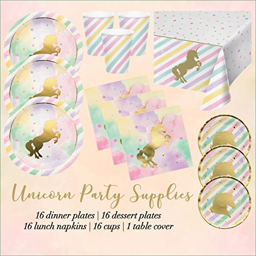 -. Feature : This magical party pack includes service for 16 guests (bundle of 65 items) / 16 Dinner Plates (9 inch) - 16 Dessert Plates (7 inch) / 16 Lunch Napkins - 16 Rainbow Cups (9 oz) / 1 Plastic Table Cover (54 inch x 102 inch) / With fun pastel colors and gold foil unicorn accents, these disposable table decorations are the perfect addition to any unicorn themed party