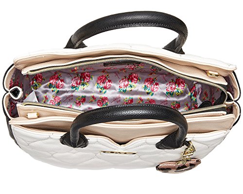 Two bags are better than one Betsey Johnson Pouch Dip Bag has plenty of space for everything and plenty of style for anything. Exterior Features Front heart shaped slip pocket with zippered Wristlet pouch that ensures stylish flair, Zip top satchel ,Double Handles 5 Drop, Removable shoulder strap 23ö Drop, Fully Lined printed Interior with Wall zipper pocket and 2 Slip Pockets. This carryall offers versatility for an everyday wear and will keep you organized with separate zippered pouch to carry the essentials.Feature