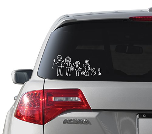 Woodland manufacturing compact kit of White Line Family Stickers are printed white on clear outdoor-rated vinyl that will last several years. This compact kit includes 1 each of Mom, Dad, Dog, Cat and 2 each of Boy, Girl. Additionally 1 each of assorted sports and style accessories are included. Decal removal is clean and easy.