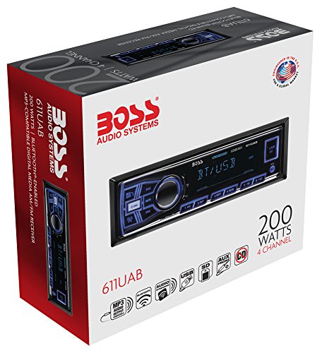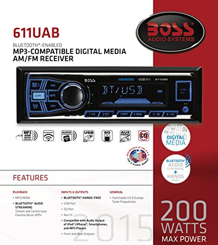 Enjoy your digital playlists with the BOSS Audio 611UAB Mech-less Digital Media Receiver. Hook your smartphone or MP3 player up with the Auxiliary input or plug into the USB and SD ports to play your own music library. You can also tune into your favorite FM/AM radio station. Kick it up a notch and use Bluetooth technology to stream music from audio apps like Pandora and Spotify or make calls hands-free. Choose your music style with the built-in Preset EQ. You can also charge any USB device on the go. Digital music rules on the BOSS Audio 611UAB. For further product details, please scroll down.Feature