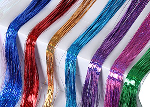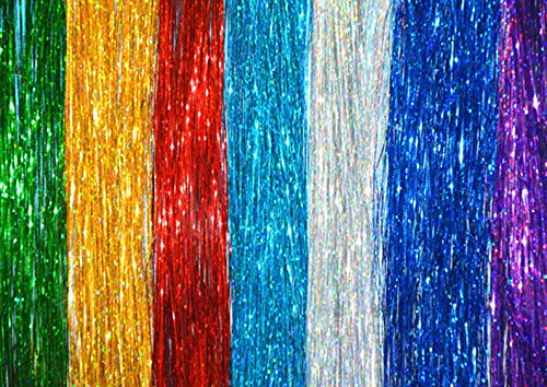 Product DescriptionMaterial: Synthetic?hair tinsel, hairpiece Color: Shiny Multi-color Hair Length: 48inch0