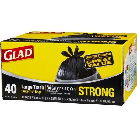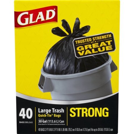 Studio : Clorox Publisher : Clorox Binding : Kitchen Product Description Glad Strong Quick-Tie Large Trash Bags with 3-ply strength help protect you and your home from garbage disasters. The strong and dependable Quick-Tie flaps allow you to close the bag by cross-tying the flaps to keep the bag securely shut. No need for inconvenient twist-tie. Quick-Tie bags are also easy to lift and carry, so you can transport even the fullest bag with ease. This 30 gallon sturdy bag is fantastic for the heavy volume and heavy loads. 0