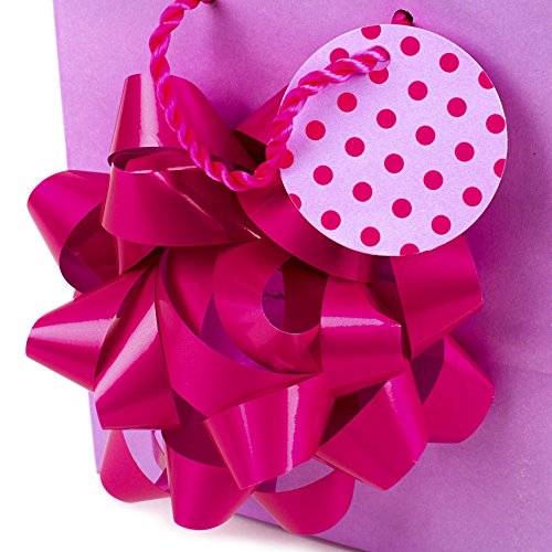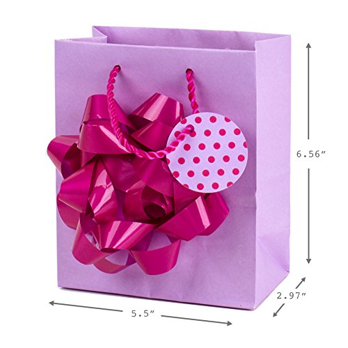 Very cute bag is sure to delight its recipients with a pink background, very prominent hot pink bow on the front, a pink polka dot gift tag, and a pink cord handle; three sheets of white tissue paper are also included. This small gift bag measures 5.5 inches wide by 6.6 inches tall by 3 inches deep and can support up to 5 pounds to hold jewelry, candies, smaller clothing accessories, gift cards, small candles, or perfume. Hallmark gift bags are made with paper from well-managed forests. Hallmark was founded in 1910 when 18-year-old J.C. Hall arrived in Kansas City, Missouri, with a couple of shoeboxes of postcards under his arm and the American dream in his heart. Hallmark products are sold online and in nearly 40,000 retail stores across the globe and people continue to recognize the iconic Hallmark brand as "the very best."Feature