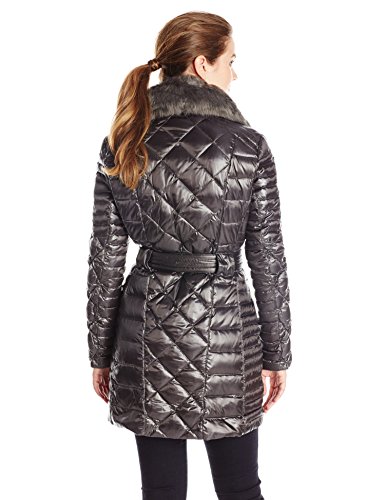 Asymmetrical belted metallic down with luxe faux fur collar. Multi stitched pattern gives a great slimming shape.