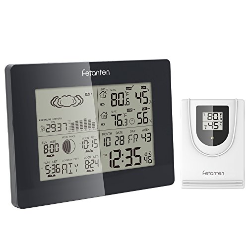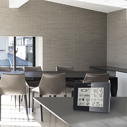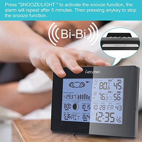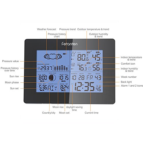 Monitor indoor/outdoor humidity and temperature ,temperature & humidity with trend and daily min/max values records.Low battery indication for indoor/outdoor.Calendar and time (in 12 or 24 hrs format) . Moon phase display. Sunrise/sunset & moon rise/ moon set calculation for 50 cities of America.