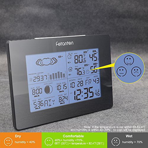 Humidity level icon indicates Comfort / Dry / Wet indoor air conditions, Humidity Range: 20%-95%RH, accuracy :2% . Temperature alert display .Temperature Range: indoor :32℉-122℉(0℃-50℃), outdoor : -22 ℉- 140℉(-30°C-60 °C) ,accuracy : ± 2℉ , °F/°C switchable.