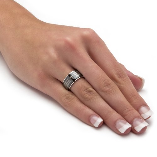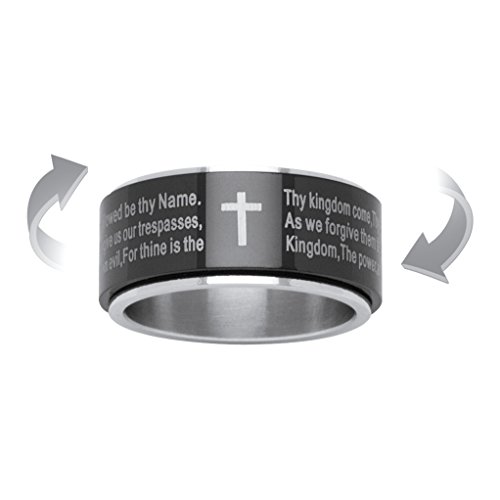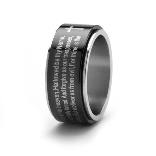 -. Binding : Jewelry -. Brand : Palm Beach Jewelry -. Color : Stainless Steel -. Department : womens -. Feature : Black ION over Stainless Steel / Item Measures 9 mm Wide x 2 mm High x 21.5 mm Long. 9 mm Shank Width / Style: Band without Stones. Imported -. MPN : 52839 -. PackageQuantity : 1 -. PartNumber : 52839 -. ProductGroup : Jewelry -. ProductTypeName : FASHIONRING -. Title : Black Ion-Plated Stainless Steel Lord's Prayer Spinner Ring