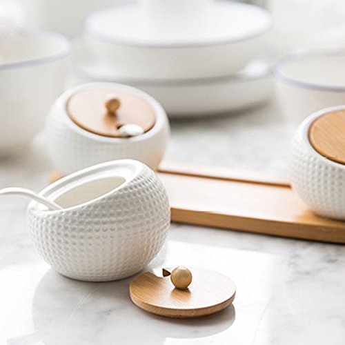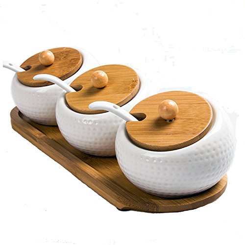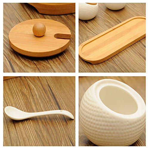 Features: -Completed condiment set with 3 jars, 3 lids, 3 spoons and 1 rack -The removable lids prevent ingredients in the jars from moisture and dust -Bamboo base rack to organize the set in place -Practical to use for sugar, salt, pepper and any other preferred seasonings -The condiment set can be a wonderful housewarming gift or a perfect gift to any occasions Specification: -Material: Ceramic and Bamboo -Color: White -Dimension for each jar: 3.5*3.5*2.5inch -Dimension for the base: 11*3.7*0.5inch -Capacity for each jar: about 6.3oz Package: -1*Ceramic Condiment Set