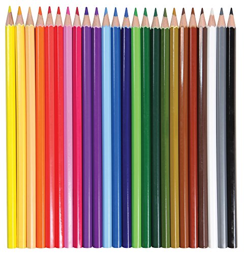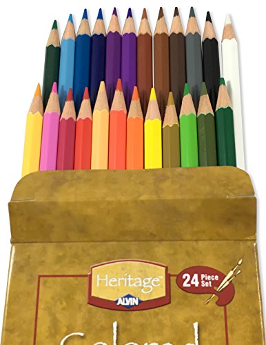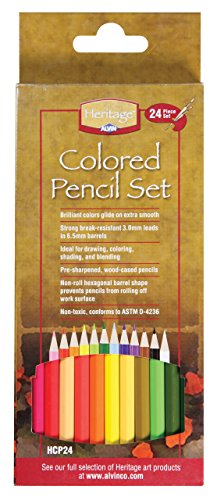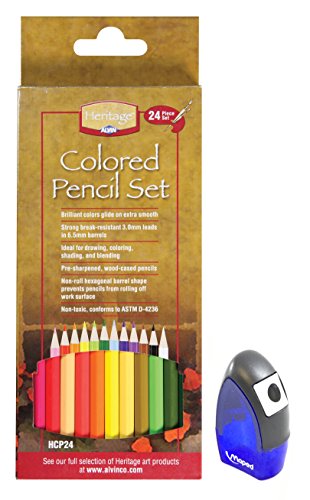 Each pencil demonstrates an optimal pigment load so brilliant colors glide on smooth. Strong, 3.0mm leads are break-resistant and are encased in hexagonal 6.5mm wood barrels. Ideal for drawing, coloring, sketching, blending, and shading techniques. Set includes 24 pencils: Dark Pink, Carmine, Cherry Red, Ivory, Vermillion, Orange, Light Yellow, Golden Yellow, Clay Yellow, Yellow Green, Olive, Emerald Green, Dark Green, Light Blue, Ocean Blue, Dark Blue, Lavender, Blue Violet, Light Brown, Medium Brown, Dark Brown, Gray, Black, White. Non-toxic, conforms to ASTM D-4236. 2 1/4" high single-hole metal sharpener inside ergonomically shaped plastic canister. Assorted color canisters.Feature