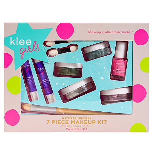 Learning about makeup is part of every girl's growing up. Don't spoil young, delicate skin with chemical-filled makeup flooding the market. KLEE Girls is formulated with natural minerals and other gentle, non-toxic ingredients. Includes Mesa Verde eyeshadow (light blue), Acadia Breeze eyeshadow (rich purple), Del Ray Reflection blush (peach pink) , Silver Sparkles body shimmer, Hartford water-based, peelable nail polish (soft pink purple), Rich Pink Lemonade and Raspberry Strudel organic lip shimmer, applicators and a full-size bamboo brush. Made in USA. Gluten free and contains NO nano particles.Feature
