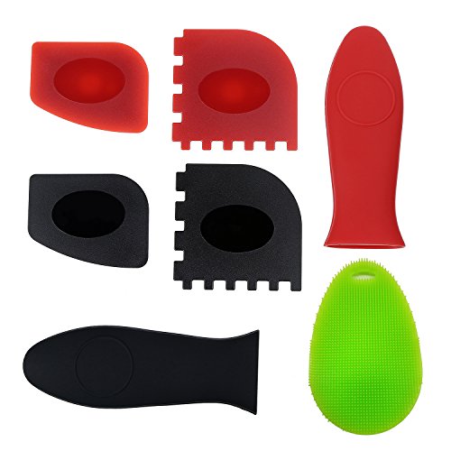 Mtlee Pan Scraper, 7 Pieces Grill Pan Scraper Tool and Silicone Hot Handle Holder with Washing Sponge for Cast Iron Skillets and Frying Pans