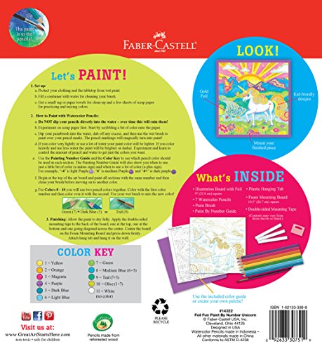 Create a magical painting with this paint by number kit from Faber-Castell. Once you are finished painting, you will reveal a majestic unicorn that can be displayed. A must-have activity for unicorn fanatics; the foil design is fabulous! Watch the magic happen when water is applied with your brush, over areas you have drawn with your watercolor pencils - a beautiful watercolor effect appears. Display your finished watercolor masterpiece on the foam mounting board we include. We also include 7 Faber-Castell Watercolor EcoPencils, pre-printed illustration board (9" square), a numbered painting guide, paint brush, foam display and mounting tape. Faber-Castell's Premium Children's Art Products are recommended by Art Educators for their Quality, Innovation, Safety and Respect for the Environment. 100% of our Children's Pencils are produced with reforested wood that comes from the over 1 million seedlings that are planted each year! Ages 7+.Feature