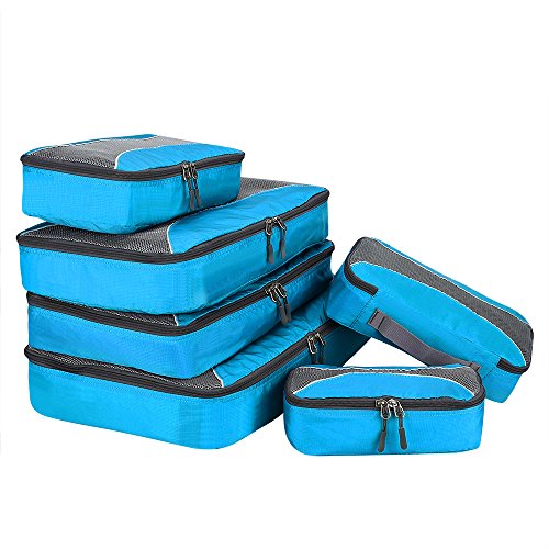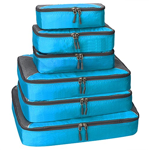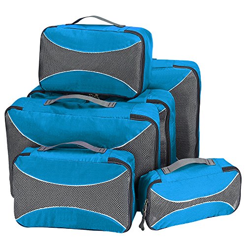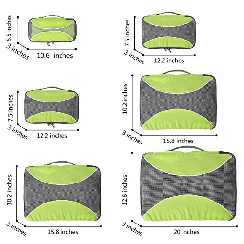 6 TRAVEL PACKING CUBES VALUE SET: 1 Large Cubes (18 x 12.6 x 3 inches),2 second large Cubes(15.8 x 10.2 x 3 inches),2 Medium Cubes (12.2 x 7.5 x 3 inches)and 1 small Cubes (10.6 x 5.5 x 3 inches )of same color. Durable High Quality Nylon Fabric that resists usual wear and tear, Quality zippers, see through mesh top.