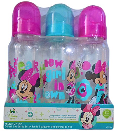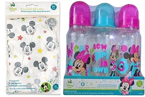 -. Feature : Includes (1) Pack of 3 Mickey Mouse Bottles & (1) Pack of 5 Disposable Mickey Mouse Bibs / Soft disposable cloth / Beloved Disney Characters / 9 oz. Bottles / BPA and Phthalate free baby bottle