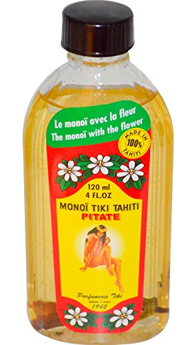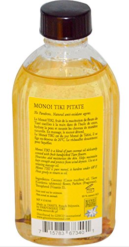 Monoi Tiki Tahiti is a blend of pure coconut oil delicately scented with fresh handpicked Tiare flowers. Nourishes and moisturizes the skin. Helps maintain hair strength and protects from wind dryness.Feature