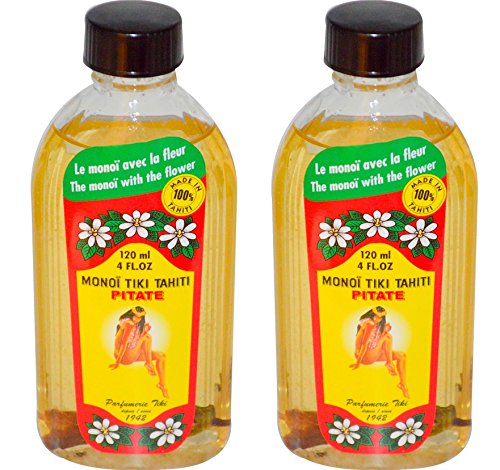 This bundle includes two 4 fl. oz. bottles of Monoi Tiki Tahiti Jasmine Pitate Coconut Oil