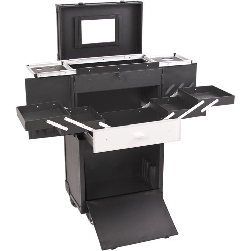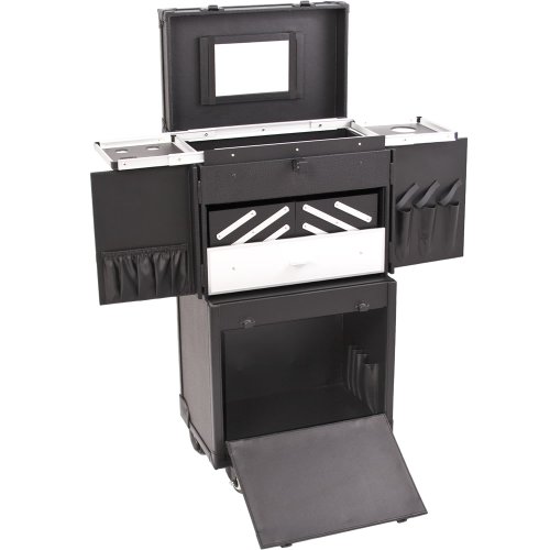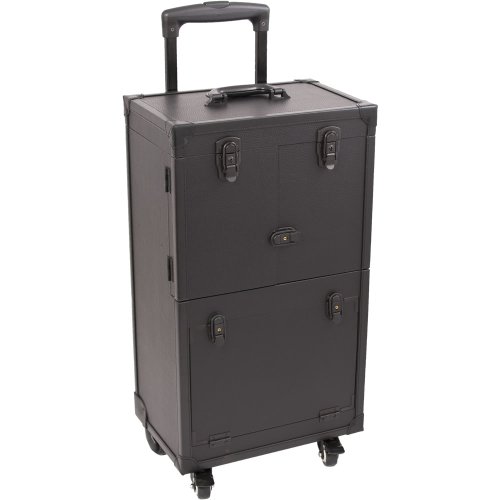 SUNRISE Hair Stylist Case C6021 Makeup Organizer, Faux Leather 4 Wheel Spinner, Trays, Locking with Mirror, Black